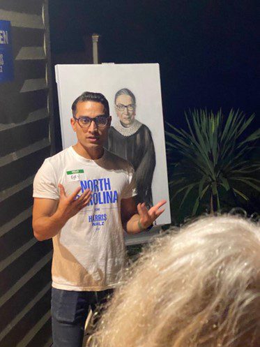 In addition to Ary Kumar, a field worker from the Harris Walz campaign, three candidates for the NC House spoke: Nicole Sidman (HD 105)(where she is running against turncoat Tricia Cotham), Beth Helfrich (HD 98)(Davidson), and Julia Greenfield, running unopposed for HD 100. All three women spoke earnestly about family (Helfrich is the mother of five), community (Sidman is the Director of Congregational Life at Charlotte’s Temple Beth El), support for public schools and small businesses, and, of course, women’s reproductive rights (Greenfield escorts women at a Charlotte health care center which provides abortion care).