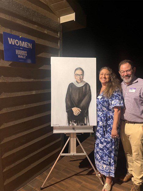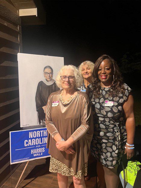 At the Havdalah for Harris event: Eileen Roth Paroff, MCDP Precinct 74 Chair and NCDP SEC Member, Stephanie Collins Frempong, Meck Dem 1st Vice-Chair, and Elaine Alexander, MCDP Precinct 10 Chair, standing by a RBG portrait done by local artist Casey Wright.