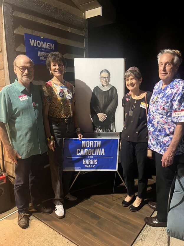 A variety of campaign merchandise was on hand: Caucus member Rebecca Freiert made a large number of beaded bracelets for attendees to take and give away (the bracelets sport such phrases as Madam President, Not Going Back, Kamala and Coach 2024, Turn North Carolina Blue). “I’m voting for Kamala Harris” and “I am woman watch me vote” bumper stickers were available. “Comma-la” buttons in Hebrew were available and worn by almost everyone – imagine a pink button with a large white comma, and inside the comma were the Hebrew letters lamed and hay. And for a feminist photo op, there was a portrait of RBG done by local artist Casey Wright.
